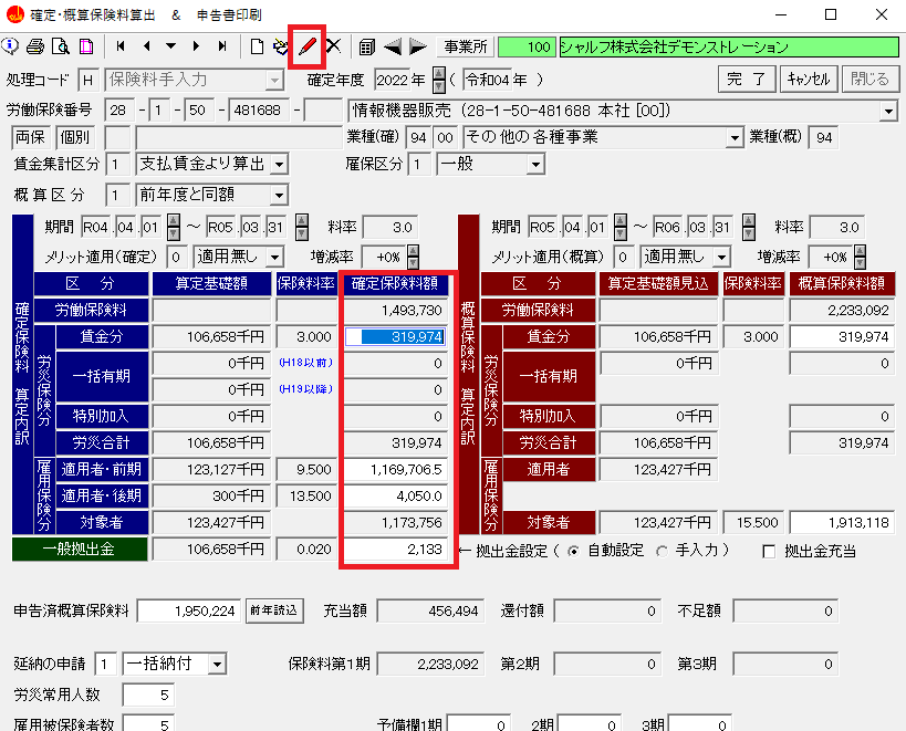 もし上記のロジックに対応したい場合は、誠に恐れ入りますが、「保険料算出&申告書印刷」メニューにて赤いペンのアイコンをクリックし、確定保険料額の手修正をお願いします。