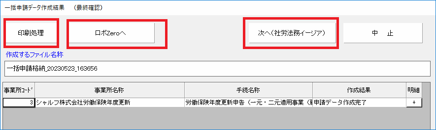 「印刷処理」ボタンからは、一括申請データの内容を出力できます。