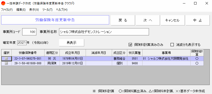 4)保険料算出がされている労働保険番号が表示されるので、選択チェックを入れて「次へ」をクリックします。