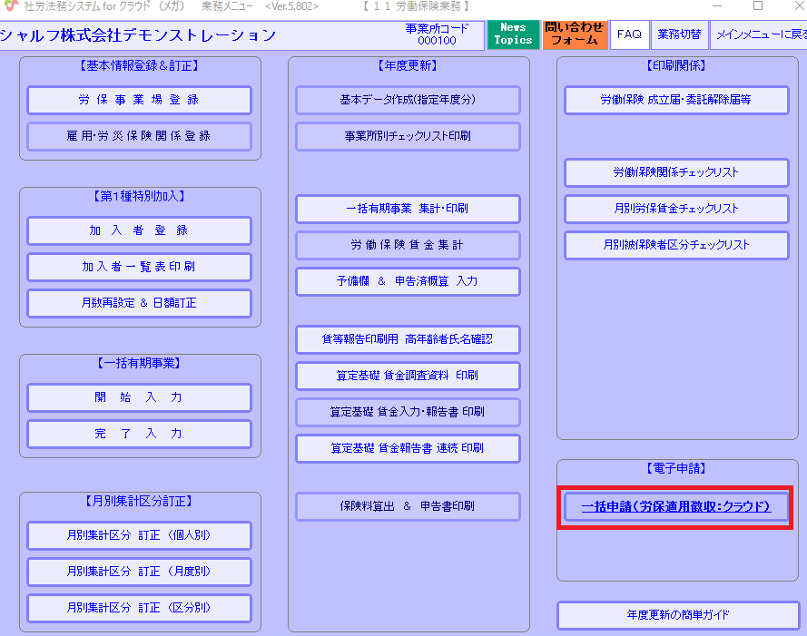 「11.労働保険業務」内「保険料算出&申告書印刷」メニューにて保険料算出を行っている労働保険であれば、「一括申請(労保適用徴収)」から電子申請をすることができます。