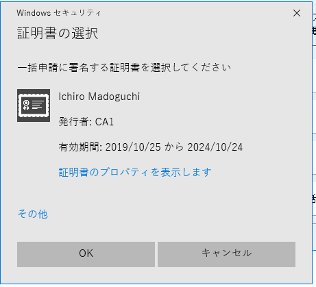 署名方法で電子証明書を選択している場合は、電子証明書が表記されますので、選択してください。