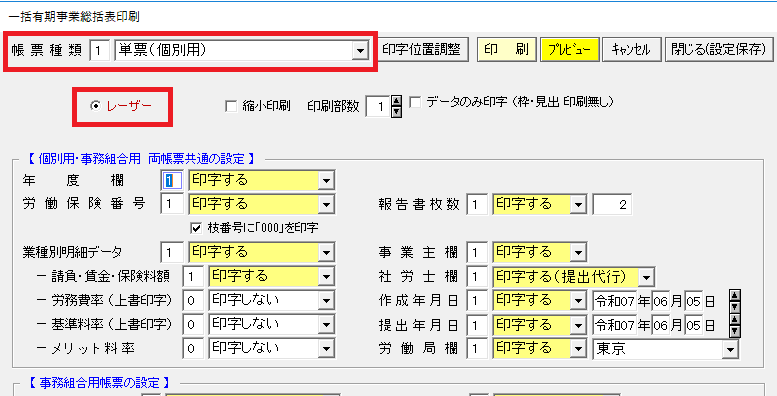 1、メニュー「11.労働保険業務」または「13.事務組合年度更新」「一括有期事業集計・印刷」
