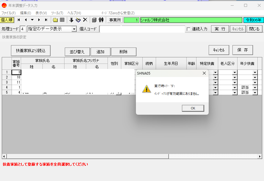 令和6年以前のデータにて扶養家族の設定ボタンから扶養家族を読み込み、保存をクリックすると実行時エラー(9 インデックスが有効範囲にありません)が発生する不具合に対応しました。