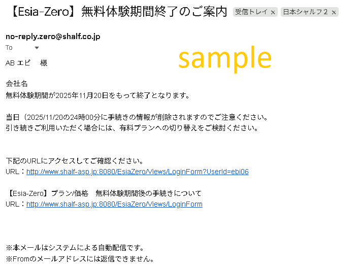 現在、無料体験期間終了前にメールでご連絡ができるようアップデートの準備をしておりますが、それまではユーザー様に利用状況をご確認いただき、継続いただける場合は、無料体験期間が終了するまでに正規版へのお申込みをお願いいたします。