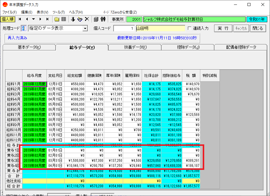 年末調整の給与データ作成をおこなったときに、賞与の表示方法がおかしくなっています。月が1・2・3・4月になってしまい、1.2.3.4以外の月にある賞与額が合算されて表示されてしまいます。