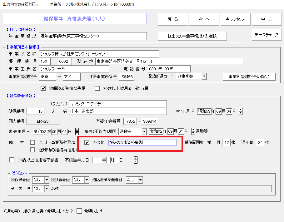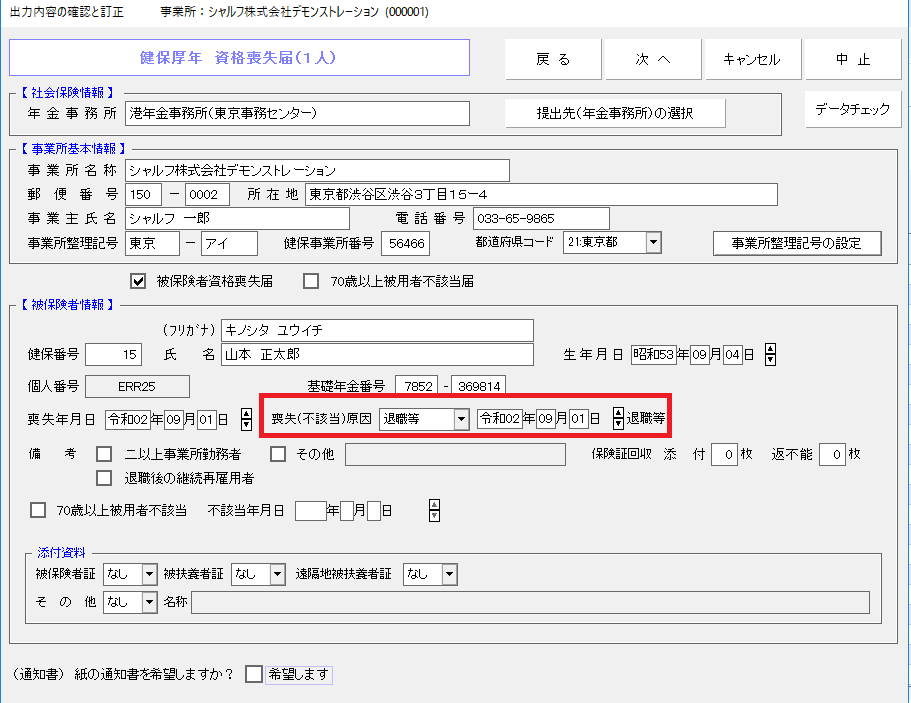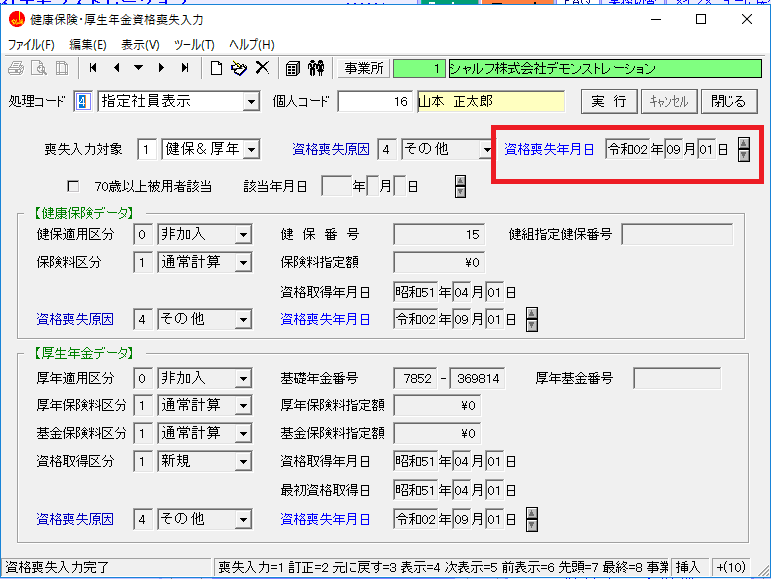 社労法務システム「健保厚年資格喪失入力」画面