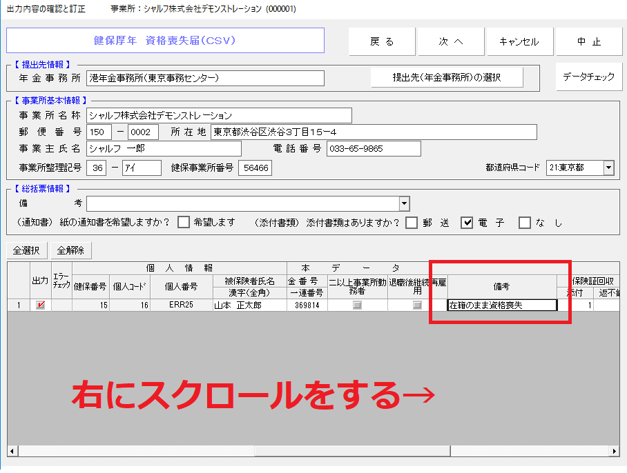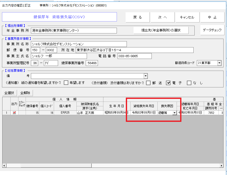 そのまま一括申請データを作成しますと、「退職日等」の欄に「資格喪失日」が反映されます。