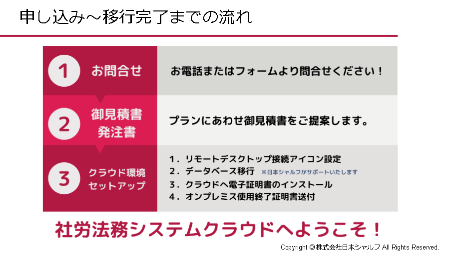 内容:社労法務システムオンプレミス版からクラウド版へ期間中移行されると、移行費用が0円&2021年7月分まで月額利用金を据え置き。