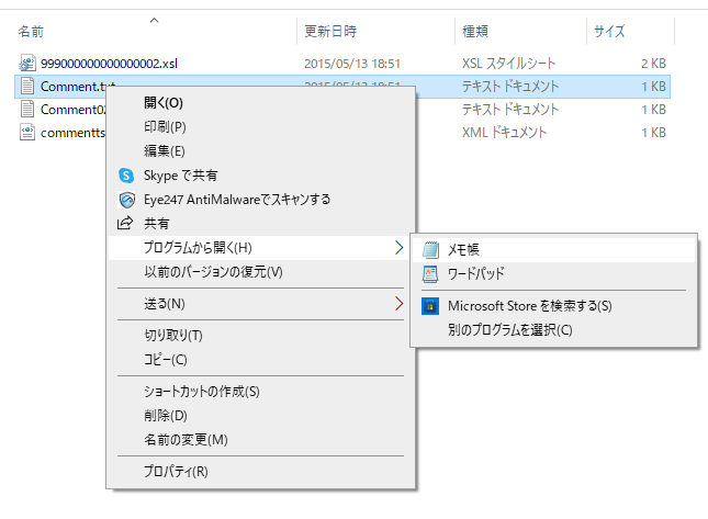 ②該当のコメントフォルダ内にあるテキストファイルを右クリックし、