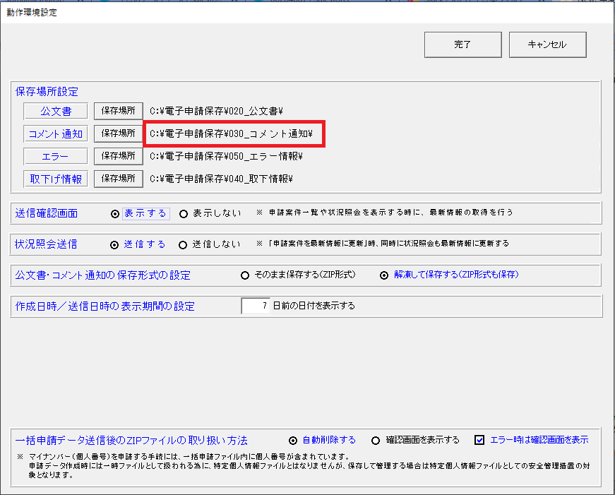 ※公文書およびコメントの保存先は「6.社保雇用業務」-「社労法務イージアAPI」メニューにある「動作設定」よりご確認いただけます。
