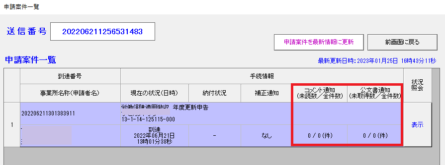 誠にお手数ではございますが、公文書およびコメントが発行されているかどうかにつきましては、当該画面より「状況照会:表示」ボタンをクリックしていただき、「最新情報に更新」をクリックしてください。