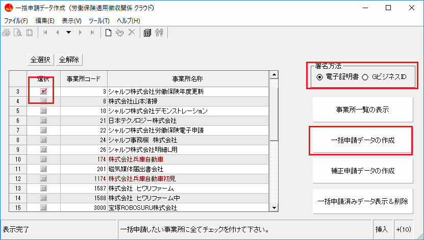 1)事業所を選択し、「一括申請データの作成」をクリックします。