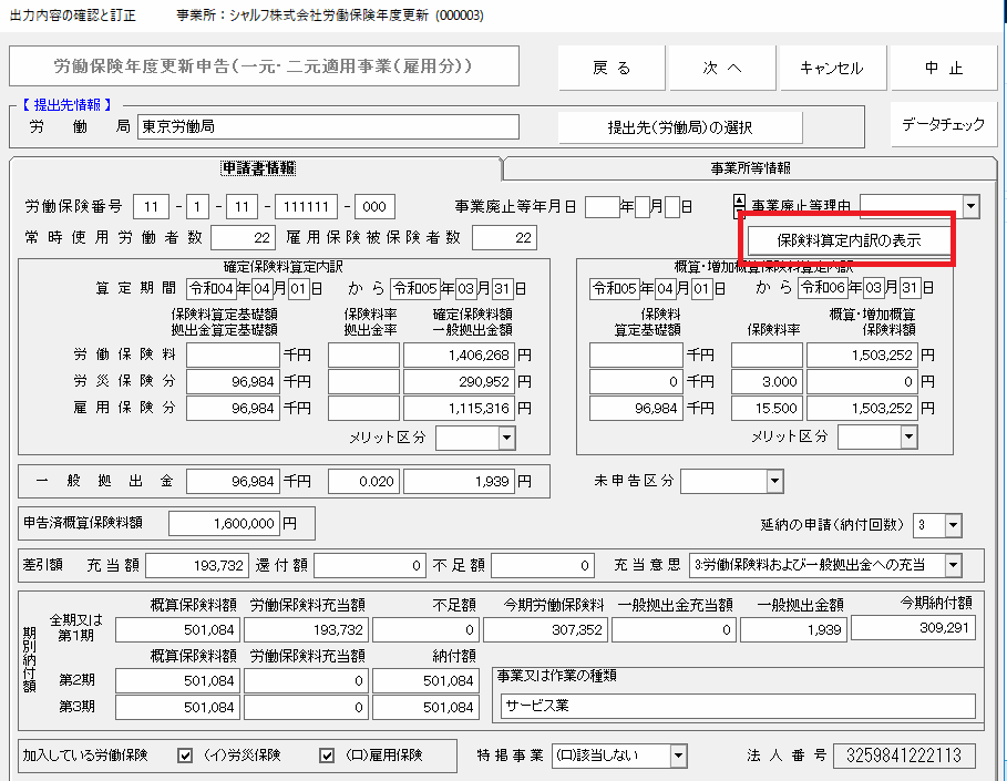 保険料算定内訳画面は、算定賃金等報告書メニューおよび保険料算出メニューのデータを元にセットしてありますが、保険料算出メニューで直接算定基礎賃金額を入力した場合は空欄になる場合があります。