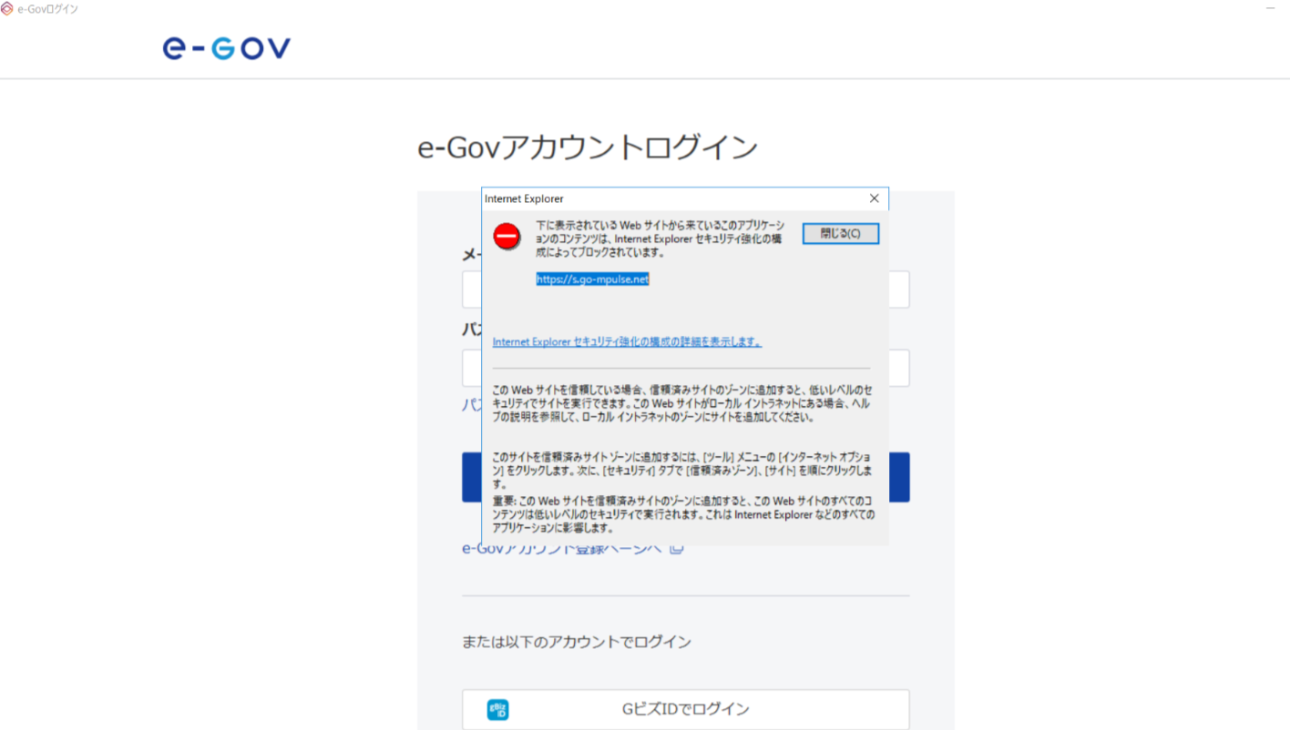 e-Govログイン時にインターネットエクスプローラーのアラートが表示される現象が起きております