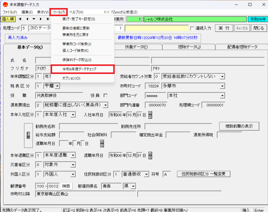 アップデートが終わりましたら、「10:年末調整」「年末調整データ入力」画面の 画面上部【ツール】を開いていただき、令和6年度データチェック画面より、不具合データの有無を確認してください。